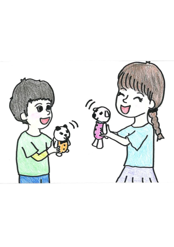 先日の自由遊びの時間、スタッフがぬいぐるみを使ってごっこ遊びをしてみせると、Aさんが楽しそうに反応してくれました。そこで、近くで遊んでいた3年生のBさんに「Bさん、これでAさんを笑わせてあげて」と声をかけると、Bさんはぬいぐるみを使って優しく話しかけてくれました。